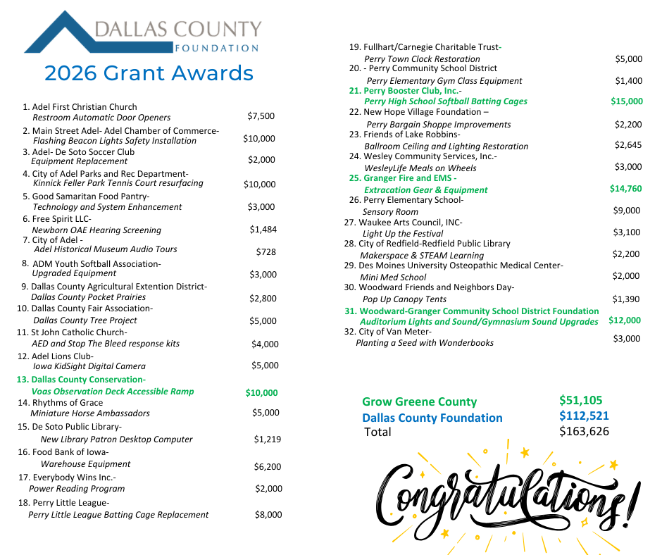 Thank you for your interest in The Dallas County Foundation of Iowa. We are a charitable foundation made possible by local citizens dedicated to improving the quality of life for those in our communities! Whether you are looking to apply for a grant or fund one, we are so glad you found us.